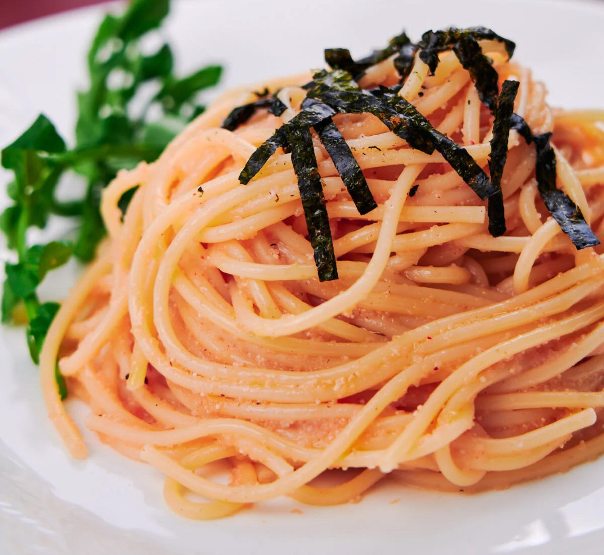 Next, add your cooked pasta to the pan, giving everything a good mix. Now, scoop out the mentaiko from the can and place it on top of the pasta. Give it a good stir, and reduce the heat to low, letting everything cook together for another couple of minutes.